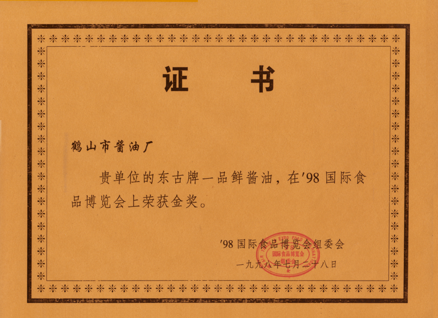 1998年金奖证书